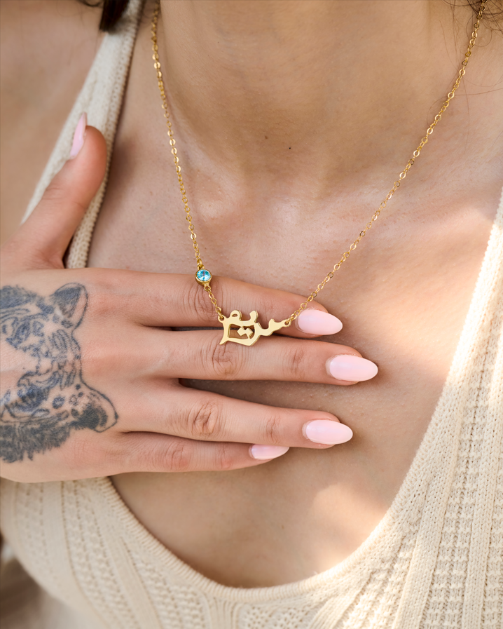 Our Arabic Name Necklace with Birthstone Charm in 925 sterling silver combines personal style with a meaningful touch. Customize it with any Arabic name and choose your favorite birthstone charm. Available in silver, gold, and rose gold, it is perfect as a thoughtful gift or a special accessory that celebrates individuality and connection.