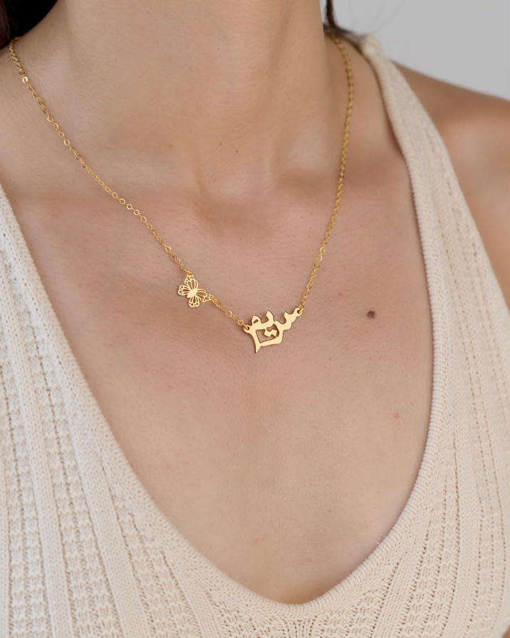 Our Arabic Name Necklace with Butterfly Charm in 925 sterling silver combines elegance with a delicate, nature-inspired touch. Customize it with any Arabic name, and enjoy the graceful detail of a butterfly charm. Available in silver, gold, and rose gold, it is perfect as a thoughtful gift or a personal accessory that symbolizes beauty and transformation.