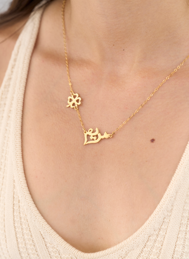 Our Arabic Name Necklace with Lucky Charm in 925 sterling silver blends personalization with a touch of good fortune. Customize it with any Arabic name, choose your lucky charm design, and select any color you love. Available in silver, gold, and rose gold, it is perfect as a meaningful gift or a signature accessory that carries both style and symbolism.