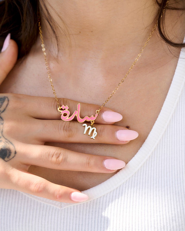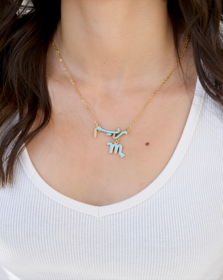 Our Arabic Name Necklace with Zodiac Charm in 925 sterling silver combines personal meaning with a touch of celestial style. You can customize it with any Arabic name, choose your zodiac charm, and select any color you love. Available in silver, gold, and rose gold, it is perfect as a thoughtful gift or a signature accessory that connects you to both your name and the stars.